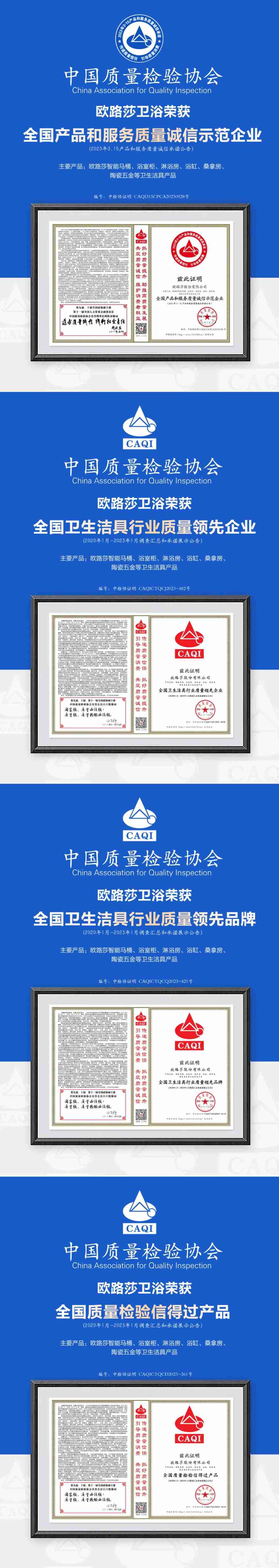 3月,歐路莎衛浴榮獲由中國質量檢驗協會頒發的“全國產品和服務質量誠信示范企業”“全國衛浴行業質量領先企業”“全國衛浴行業質量領先品牌”“全國質量檢驗信得過產品”四大獎項。