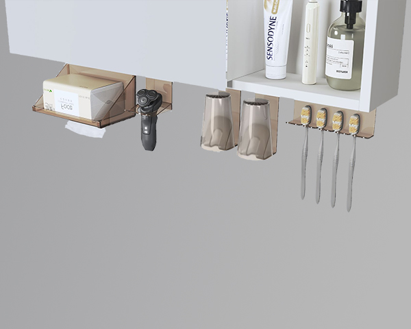 超強鏡柜收納,結合新型集成式置物架,時尚簡潔,專區專用,平推式自由移動,便捷式安裝,收納有序
