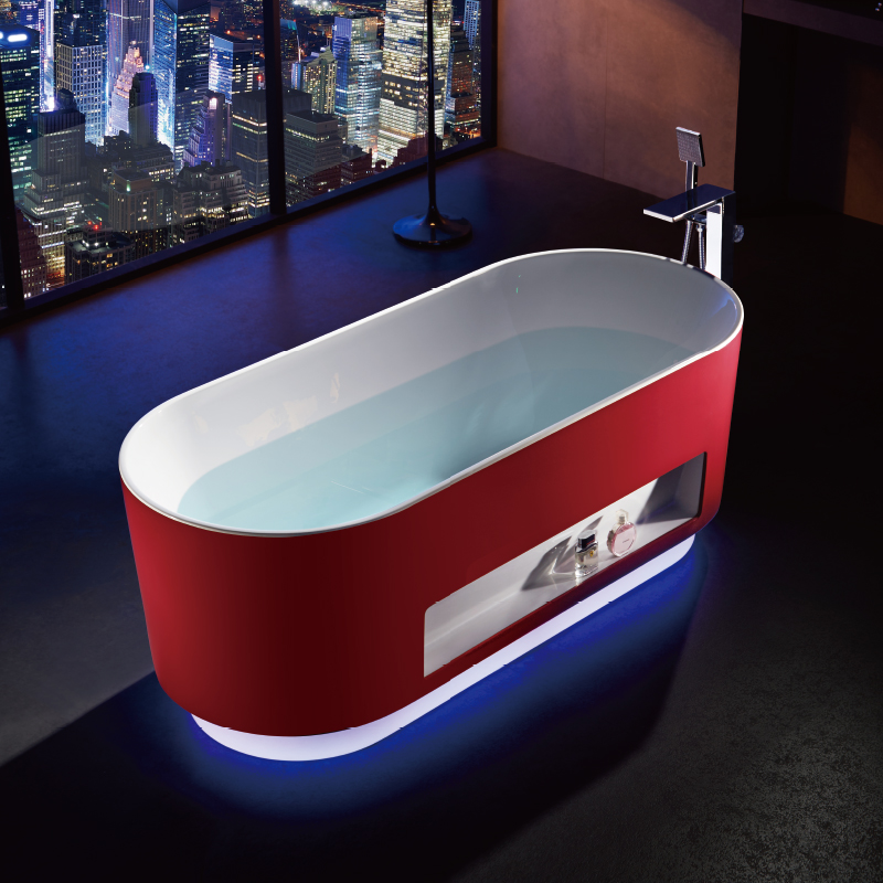 全新浴室概念,大膽創新雙色無縫一體,裙邊內嵌置物,配以微波感應360°立體感應七彩燈帶,玫瑰紅嫵媚動人,智感十足。