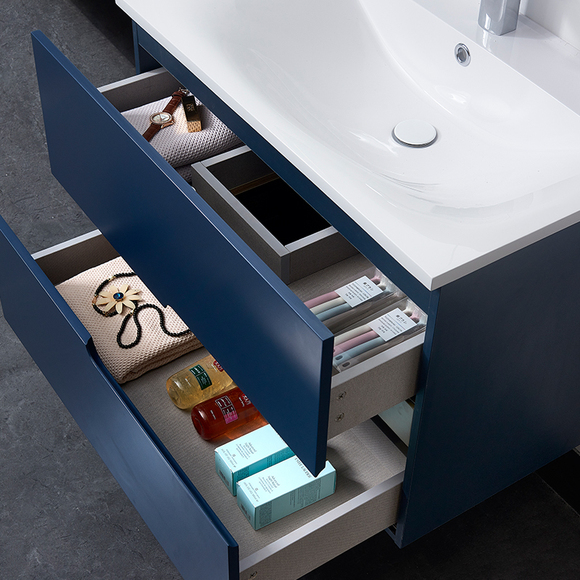 靜音阻尼液壓滑道,輕松緩沖; 主柜超大容量,鏡柜分隔收納,合理放置讓浴室更加整潔有序。