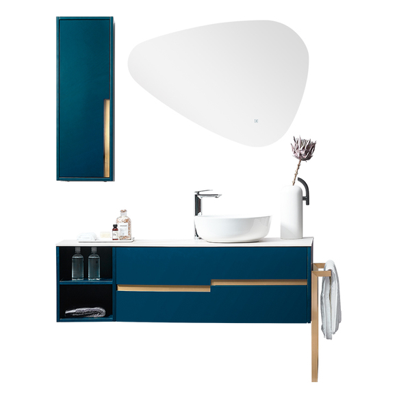 實木多層板,層層精工,防水防潮;304不銹鋼金色柜腳,防腐防銹;巖板臺面舒適手感,質感陶瓷臺上盆;靜音液壓滑道,輕松緩沖。