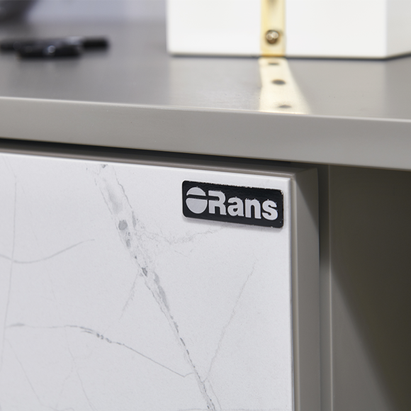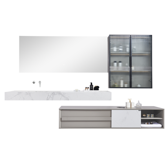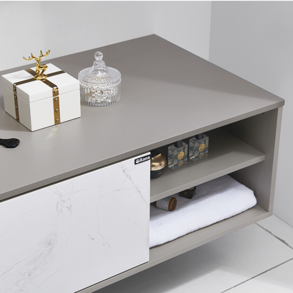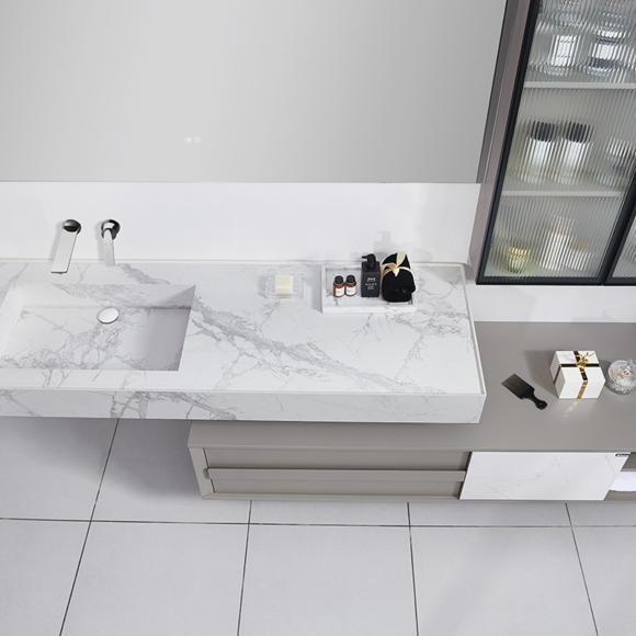 簡約卡其色的柜體與寒江雪巖板門板、一體盆結合,簡約中盡顯奢華。